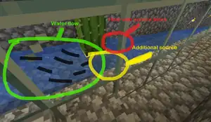The Canal-Style System still suffers from the mobs freezing when outside a certain range around your character in Java Edition, and from the limitations of low population density caps in Bedrock Edition. Active Systems can correct that problem. One example is using Redstone and Dispensers filled with a Water bucket to flood the spawning grounds repeatedly, flushing all mobs into the channels to be transported to the grinders. Thus, the farm provides area for the mobs to spawn in, but does not rely on mob movement to get them into the grinder. Using this, one can omit the trapdoors needed for the other, passive designs.