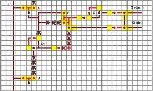 Here you can see one section of the decoding system. The initial decoder doesn't require the first AND gate and instead comes straight from the input 'I'. When the first input comes through it will be sent into a length detecting AND gate 'B' or the repeater and gate, if the signal is long enough it will be able to pass through this AND gate and then power the RS-NOR 'C', which will then allow the Q for dash to be on. If the length of the signal is not long enough to pass through 'B' it will then not activate the RS-NOR, instead it will just go where the signal also goes which is round to the next 'C^', rs-nor which once switched will send a signal round to 'B' therefore not allowing any more signals to pass through. When this happens the power from the 3rd input of the 3 input 'and' gate 'B' will go to the Q(dot). If the power for the dash is on then it will override the dot turning it off, if it is on otherwise if the dash had been activated and then the signal goes through the dot would also be on, so you will need to make the dot turn off when dash is on, you can do this as shown, feeding the power back into the Q dot.