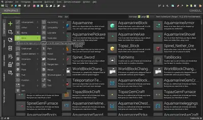 Simplifies the process of making mods by minimizing the amount of coding that has to be done, instead providing the option of pick-and-choose menus if preferred. Includes multiple tools and base textures to start creating blocks and items from, and is free to download and use. It can also make Java Edition data packs. | Active | Java Edition 1.21.8, Java Edition 1.21.1, Java Edition 1.20.1, Bedrock Edition 1.21.x, more with plugins and with updates | Yes | Java/Visual Interface | Pylo | ||