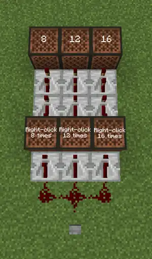 - Half note (exclusively "Twinkle Twinkle Little Star"): 4 tick repeater + 4 tick repeater + 4 tick repeater (12 redstone ticks)