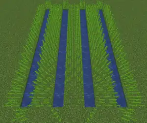 A more efficient grid pattern design can also be used. This design has 4 sugar canes per water source, so it is highly compact. Placing lily pads or something similar on top of all water blocks makes the ground smooth and easy for the player to walk on without falling. Light blocks can be used under or above the water to prevent mob spawning. Slabs or trapdoors can be placed as waterlogged blocks in the upper half of the water sources instead of lily pads without interfering with their ability to sustain plant growth.