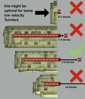 For Tunnlers the TNT should not have a sideways velocity above 2-5 (depending on the target's blast resistance and the aspired reliability). To prevent that when shifting far to the side, slanted shifting has to be avoided or be used in combination with other shifting techniques. Sometimes decreasing the velocity can increase, how far slanted shifting is still viable but that might bring new drawbacks such as additional shots being needed to destroy the target.
