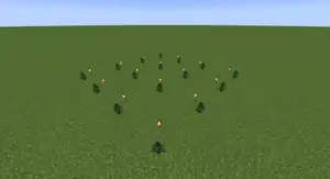 Using the same spacing as a birch farm, one can grow individual jungle tree saplings as small jungle trees. Without fortune enchantments, a single tree would not produce enough saplings to replace itself. A 3×3 grid of trees growing usually produces enough saplings to replace itself in the long term, and occasionally produces 1-2 excess saplings. After 6-7 real life hours of hovering over the farm, cutting down, and replacing trees as they grow, a profit of about 10-20 saplings can be accumulated this way. A starting supply of 9 planted saplings and 18 back stock for the eventual stretch of losses is necessary to keep the initial tree grid planted at all times. After enough iterations, the ultimate result is a profit in jungle saplings.