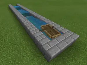 The Water Tram is a fast travel creation which consists of streams of water flowing in the direction you wish to travel. Water trams are usually created using water, a boat, and pressure plates. Since water flows in both directions, the pressure plates are necessary to break the water up into streams flowing only in the direction you wish to travel.