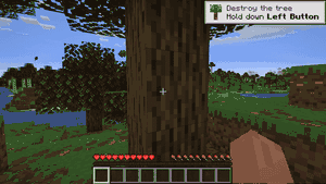 Tutorial hints are obtained by simply completing the task given. Each hint, minus the "Open your inventory" and the "Craft wooden planks" hint, have a progress bar that shows the player's progress on the current hint and fills up as it is being completed. For example, for the "Destroy the tree" hint, the progress bar begins emptying and starts filling up as the player harvests a log, so that when the log is destroyed, the bar is complete and the hint disappears.