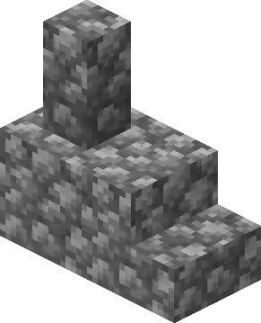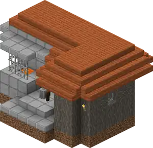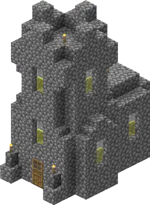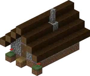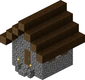 Entry stairs are optional for all buildings, and do not spawn if the door/entrance is at street level. A building spawned above street level has stairs leading straight out from its entrance down to the street level, with cobblestone blocks as a foundation extending below the first floor if the building did not spawn on a flat spot. Also, all asymmetrical buildings can spawn as shown below or as a horizontal mirror image.