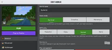 The edit world screen in Bedrock Edition allows for various settings to be changed and add-ons to be enabled. Worlds that are stored locally on the device can be edited, as well as worlds in an owned Realms server. The edit world screen for local worlds uses Ore UI, while the edit world screen for Minecraft Realms uses the Classic UI, making them look vastly different while offering almost the same options. The Ore UI version of the edit world screen for Minecraft Realms can be enabled with a button at the top in Minecraft Preview.