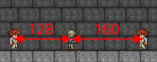 Consider a Skeleton with a player on either side of it, all lined up so that their vertical distances are zero, as shown in the image to the right. Assuming that both players have an aggro value of 0 (the standard case), the Skeleton will target the left player, as the taxicab distance between them of 128 pixels (or 8 tiles) is smaller than the taxicab distance to the other player (160 pixels, or 10 tiles). When the player on the right increases their aggro value to 100, the distance formula looks as follows: