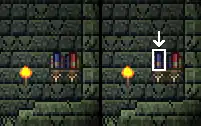 Some passages are blocked off by Cracked Dungeon Bricks. These blocks look almost identical to regular Dungeon Brick, but appear slightly crumbled, and drop no blocks when destroyed. Breaking one block may break adjacent false blocks in a chain similar to the behavior of Desert Fossil. False blocks may also break spontaneously when the player walks on them, uses a hook, or hits them with projectiles. Using a Dangersense Potion will highlight these blocks. Cracked Dungeon Bricks also conceal large, rectangular rooms lined with spikes and occasionally filled with water, so caution is advised.