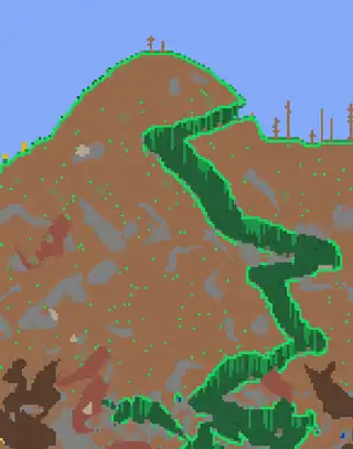 The Mountain Cave is a structure typically found in the Forest biome. It consists of a high Dirt mountain and a zigzag cave leading to underground within it, serving as an option for early-game players to go underground easily. Pots and Wooden Chests can often be found in the cave.
