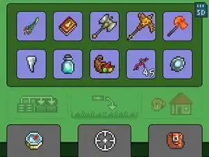 The touch screen features the player's hotbar, housing menu, map, and other utilities. This is referred to by the game as the "Quick Inventory". The quick inventory shows the first ten slots in the player's inventory, similarly to the mobile version of the game. The top left button under the hotbar allows the player to Quick Stack to Nearby Chests, which will be greyed out if the player is not near any chest. The middle button allows the player to drop an item they have tapped and held onto, greyed out if there is no item to drop. The top right button is the housing menu, which will be greyed out unless the player is in a house.