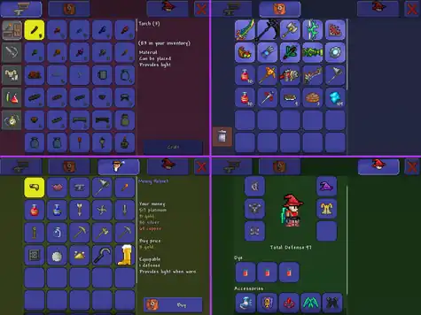 At the top of the inventory screen are four buttons (five if near a chest). The first, being a back arrow, causes the player to exit the inventory. The rest toggle the crafting menu, the inventory, the chest's inventory (if applicable), and the player's armor/accessory screen.