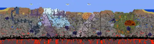 Shortly after the Wall of Flesh is defeated, two diagonal strips of Hallow and Corruption/Crimson will generate in a V shape. The location of these strips and distance between them is completely random (but is determined by the world seed, so rolling back to an earlier save cannot be used to generate the strips in different locations), but if the player has done a lot of previous underground exploring, the affected areas will be very clear. These diagonal strips will begin spreading as soon as they appear, so they can wreak havoc if left unattended. However, immediately trying to stop the spread is not recommended. The new enemies can easily kill players at this point, and the tools available are not powerful enough for the task. Therefore, it is wiser to wait until better gear is acquired.