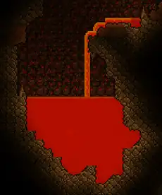 Lava is a glowing red-orange liquid found deep in the Cavern layer and throughout The Underworld, appearing instead of water at depths below approximately 950 feet (475 tiles) in a small world, 1,450 feet (725 tiles) in a medium world, or 1,950 feet (975 tiles) in a large world (on average).[1] Tiny pools can frequently be found on the outskirts of the Underground Desert(Desktop, Console and Mobile versions) as well, even as high as 200 feet below the surface.