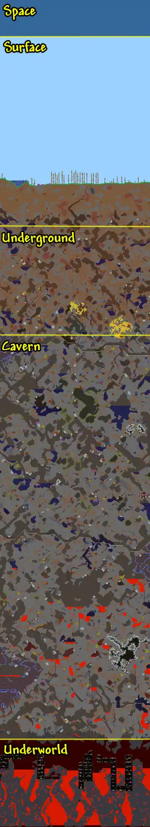 A world in Terraria is divided into five layers, each appearing at different depths, or elevations. Each layer has its own characteristics, and most layers contain multiple biomes.