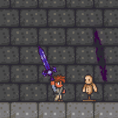 The Light's Bane is a pre-Hardmode broadsword. When swung, it creates a dark slash near the tip of the sword. The slashes deal 50% of the weapon's damage (8 base damage),[1] have 5 armor penetration,[2] pierce once, and will automatically target enemies within a radius of 3.125 tiles.[1] The weapon also has a chance to create a big slash that deals 100% of the weapon's damage. The chance of big slashes occurring is equal to the player's melee critical strike chance.[1]