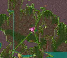 Plantera now occasionally releases floating pink Spore projectile enemies that drift toward the player, similar to the spores released by the Giant Fungi Bulb. They can be destroyed in a single hit with any weapon or tool, but travel through blocks and deal high contact damage. Similarly to the first phase, the cooldown between the release of Spores depends on Plantera's health:
