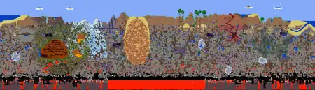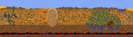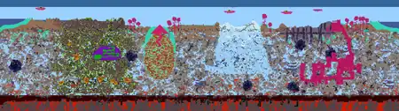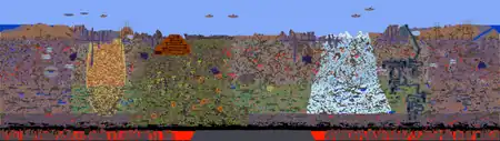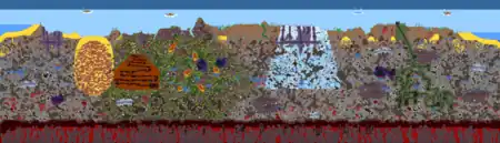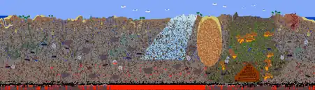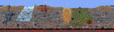 Desktop 1.4.4.9 source code, method GenerateWorld()inTerraria.WorldGen.cs. - ↑ Information taken from the