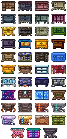 Storage items are Furniture items that can be right-clicked after being placed, to reveal forty Inventory slots, in four rows of ten, for storing items. These items allow the player to offload excess items, freeing space in their inventory. They can also be used for organizing items, eg. one Chest can hold Ores, while another can hold Gems. Stationary storage can also be renamed, to further help in organizing items (see Rename below).