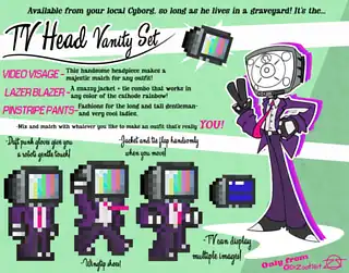 The TV Head set is a vanity set consisting of the Video Visage, the Lazer Blazer, and the Pinstripe Pants. It is one of the six sets that were added as part of the Journey's End Vanity Contest; the original concept was submitted by Dr.Zootsuit.
