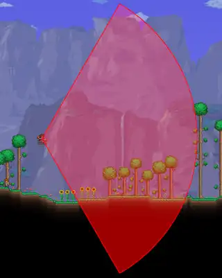 ↑ Information taken from the Desktop 1.4.4.9 source code, method UpdateEffects() in Terraria.Mount.cs. The angle between the vector from the player's center to the enemy's center and the X-axis must be ≤1.0471975949079879 rad = 60.000003° when facing right and ≥2.0943951461045853 rad = 120.000003° when facing left. Since the absolute value is considered, this is mirrored below the X-axis. Furthermore, the length of the vector must be <850 pixels, i.e. 850/16 = 53.125 tiles.