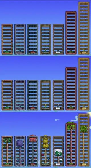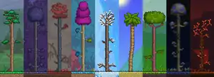 All tree types in their respective biomes. From left to right: Purity/Forest, Corruption, Crimson, Hallow, Snow, Ocean/Oasis, Jungle/Underground Jungle, Mushroom, Underworld.