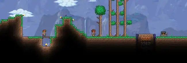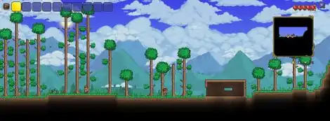 | [11] | There is a Floating Island at the top of the world with a building on it. This building consists of Gold Bricks and a Chandelier, and has two chests inside, the leftmost chest containing a Gold Axe and 99 Torches, and the rightmost one containing a King Statue and a Mug. It can be reached by placing exactly 85 platforms straight upwards at the top of the nearby hill, and then building rightwards. |