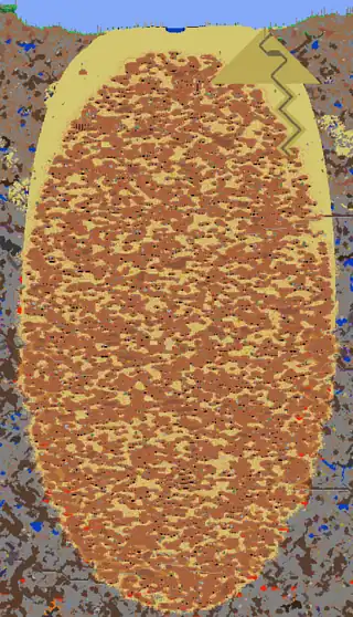 The structure of the Underground Desert resembles that of a real-world ant hive, featuring numerous small caves mainly composed of Sandstone Blocks and Hardened Sand Blocks, which are connected in varying degrees. It is always either circular or oval in shape and is very large, rivaling even the Dungeon in size. Many types of Antlion enemies inhabit the Underground Desert, and it is also riddled with traps, namely Antlion Eggs, Rolling Cacti, and sand traps, making it a challenge to navigate.