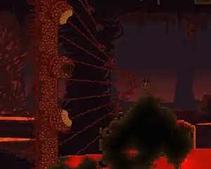 The Wall of Flesh is very large, occupying the entire screen vertically. Once spawned, it slowly sweeps across the map in a single direction, forcing the player to constantly move away for the duration of the fight while also contending with the Underworld's usual hazards.
